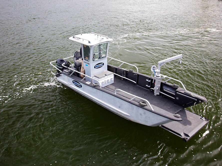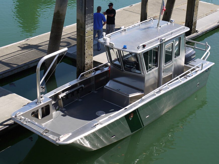 The same heavy-duty construction and attention to detail that we put in our larger vessels are also used in our 24’ Series. Incorporating a wide bottom for maximum stability and 64” wide bow door, you can rest assured that you have the most proven 24’ workboat made today. It is popular for transporting ATVs, dive gear, oil boom, fire pumps and anything else that will fit on board. Our 24 is even big enough for an enclosed cabin without compromising too much deck space.