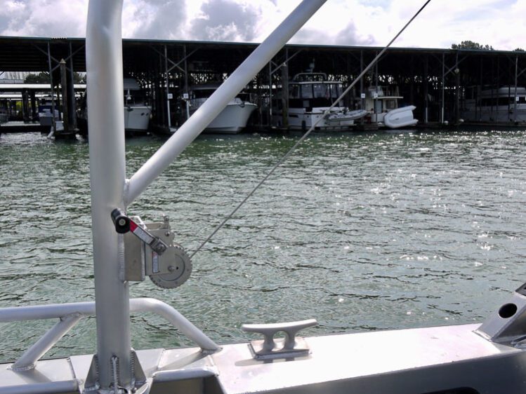 Lake Pend Oreille, ID: The US Army Corps of Engineers selected this 24’ Packcat for maintenance operations at Albeni Falls Dam, the site of a natural waterfall. Outfitting includes 5” tow post with 12V powered tow line reel with 150 feet of 5/8” synthetic floating line, engine guard, push knees, cargo deck tie down pockets and 3” pipe davit with 12V Powerwinch. Navigation electronics include a Garmin 8610xsv touchscreen plotter/sounder and marine VHF. A retractable bimini top covers the cargo deck. Twin Mercury 200’s provide plenty of power for pushing and towing operations.
