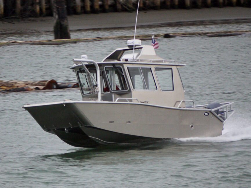Coos Bay, OR: The Port of Coos Bay is a deep-draft coastal harbor and Oregon’s second busiest shipping port. The Port District selected this 24’ Packcat as multipurpose utility boat with bow A-frame for lifting 1000 lb. anchors for maintaining aids to navigation. Additional outfitting includes a tow post, engine guard, push knees and 500 lb lifting davit. Simrad navigation electronics, LED flood lights and a remote controlled spot light complete the package.