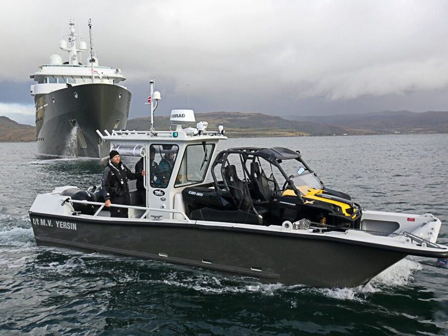 Abu Dhabi, UAE: This 24’ Packcat is used as a tender for a superyacht in the Middle East. Four point lifting eyes allow the vessel to be launched and retrieved from the main deck. Port and starboard side doors allow for ease of boarding and diving operations. Additional outfitting includes bow and stern anchor windlasses, 2 dive ladders, dive bottle racks, Raymarine electronics and canvas enclosure for the center console.