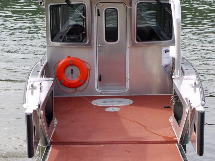 Tulsa, OK: The US Army Corps of Engineers Tulsa District operates 8 hydroelectric power plants in Oklahoma and Texas. Their 25’ Munson utility boat is used for environmental cleanup, aids to navigation, law enforcement, and emergency response. Outfitting includes a davit with 12V winch, push knees, tow post, engine guard, search light, strobe lights, depth sounder, and trailer.