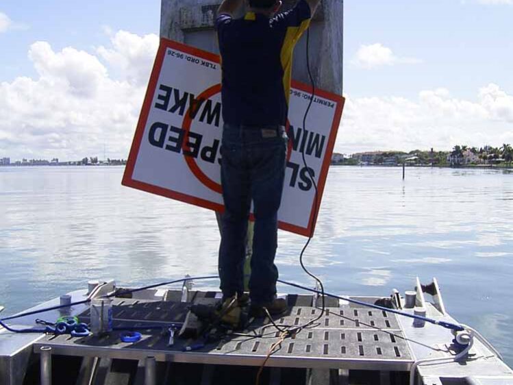 Sarasota, FL: Sarasota County Coastal Resources focuses on a number of shoreline interests, from maintenance of navigable waterways to shoreline enhancement and habitat restoration. To maintain aids to navigation they ordered their Munson with a special bow door platform and work table. This allows the crew to comfortably work on signs and beacons. A special pile grabber mounted on the bow door keeps the boat in place while working.