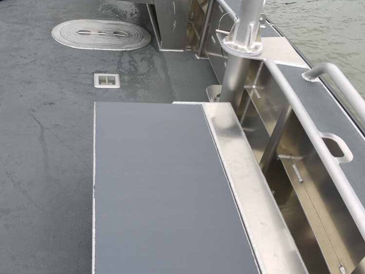 The Netherlands: This 28’ Catamaran Tender was built to service a Damen Exploration Yacht. Outfitting includes a unique low profile roof top lifting system, port and starboard boarding doors, removable tow post, fuel transfer pump, fresh water wash down with shower wand, stereo, Garmin navigation suite, flip out pedestrian ramp on the bow door, 12v LED spot light, dive bottle rack, dive ladder, interceptor trim tabs,12v anchor windlass and hydraulic jack plates.
