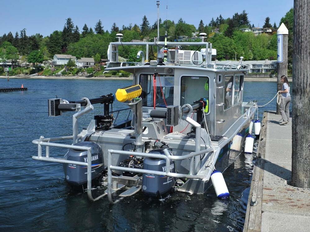 Lacey, WA: The Washington State Department of Ecology use this boat is use as a shallow-water hydrographic survey and research vessel in Puget Sound, the Columbia River, and outer Washington coast. The wheelhouse features a workstation with room for computers and survey equipment. An enclosed head can accessed from the main deck. Survey transducers can be deployed via the moon pool on the aft deck.