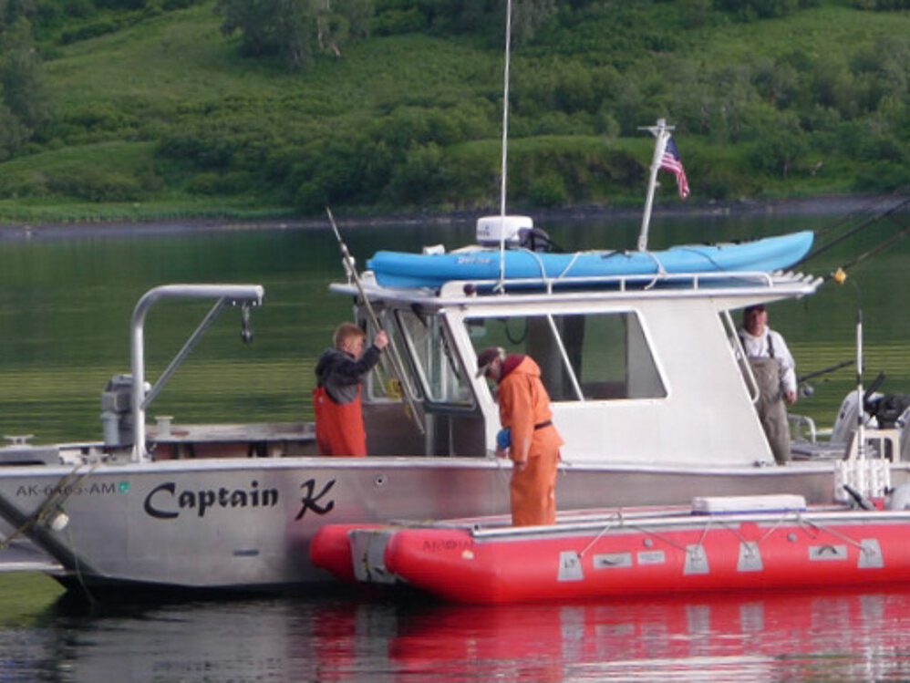 Kodiak, AK: Ugak Bay provides world class saltwater fishing for silver, king and pink salmon, halibut, lingcod and a variety of rock fish. AlpenView Lodge maintains a variety of boats to access these fisheries, the pride of which is the Captain K. The open back wheelhouse features a head compartment. Fishing equipment includes a rocket launcher rod rack, down rigger mounts, and a davit with 12V pot puller. Rod storage is provided by an overhead roof locker.