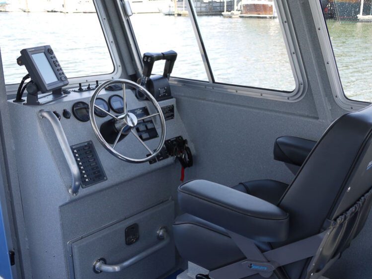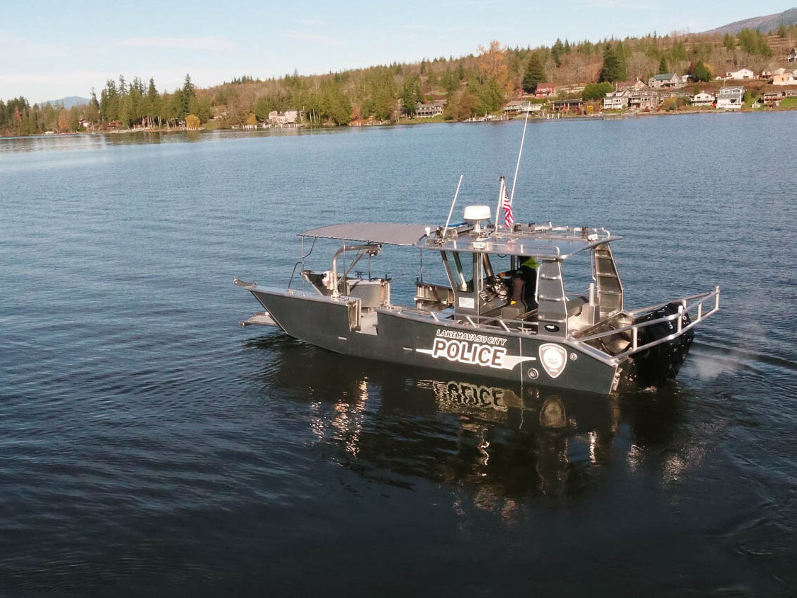 Flathead Lake, MT: Based out of Polson Montana on the south shore of Flathead Lake, the Lake County Sheriff patrols and protects the lake's many hunting and fishing destinations. The wheelhouse is outfitted to be functional and versatile. A bench locker on the port side provides plenty of storage for equipment and doubles as a EMS stretcher table. Heat is provided by a Webasto forced air heater. A pair of Honda's new 250 hp outboards put down an impressive top speed of 52 mph.