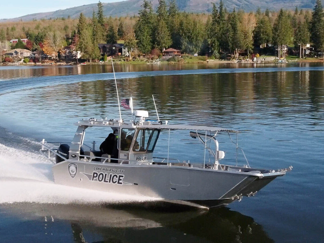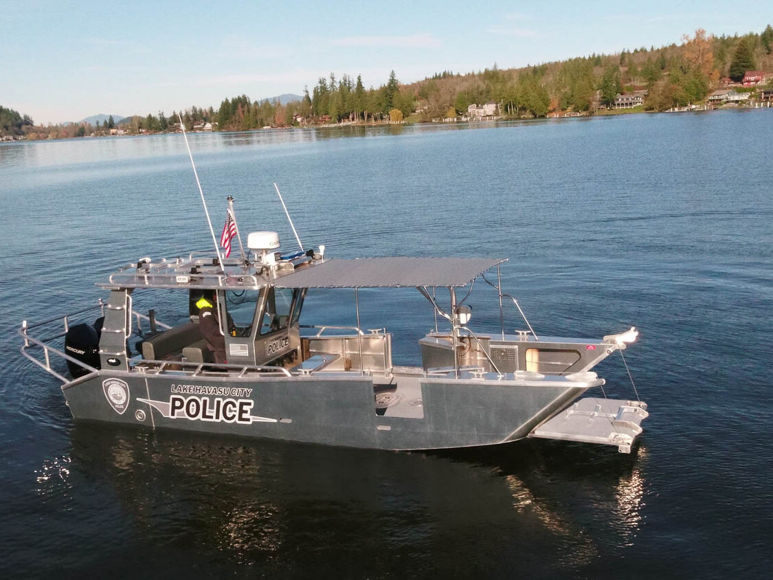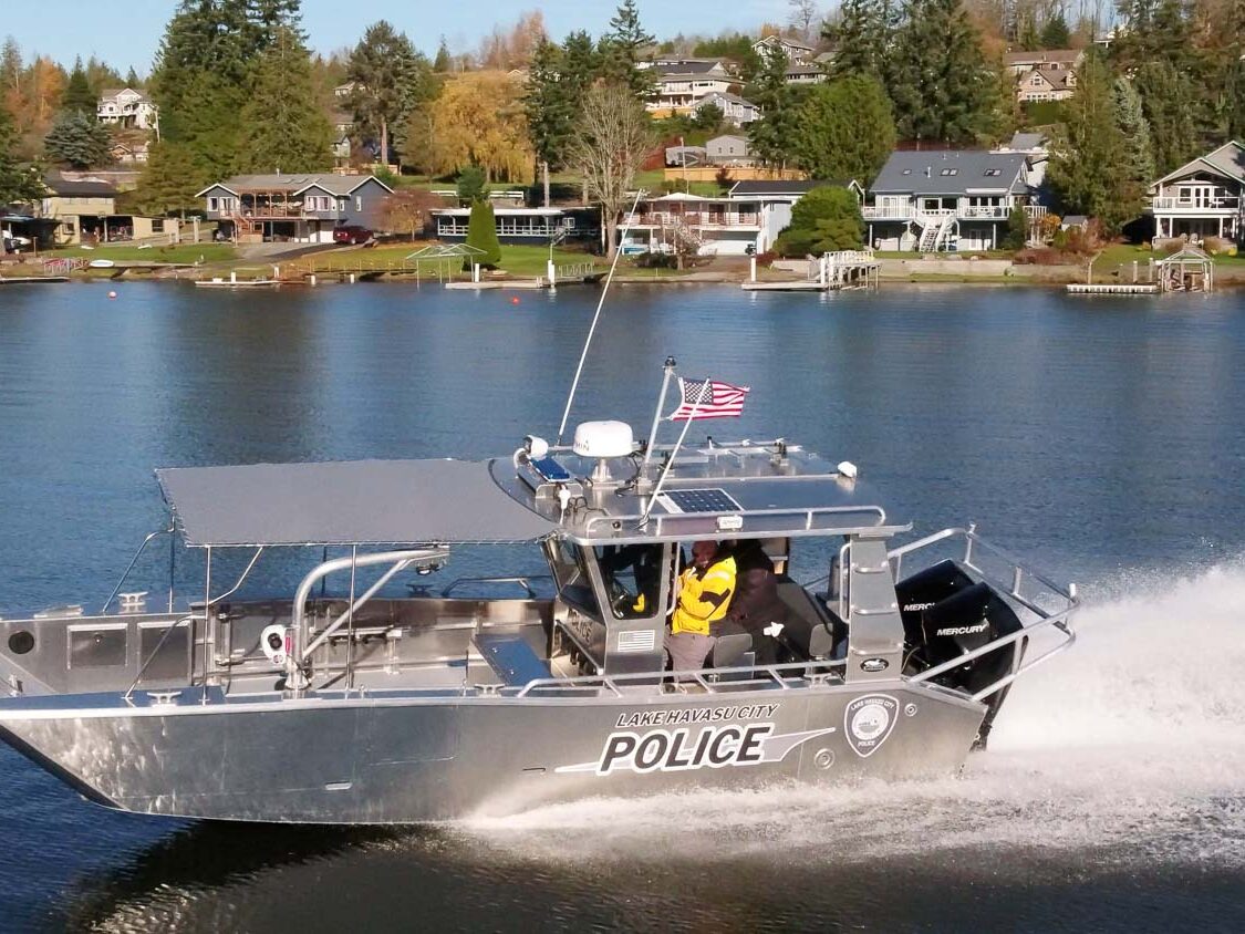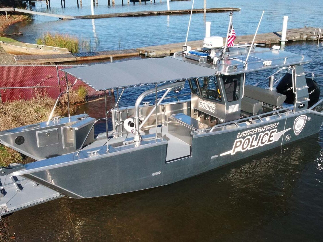 Lake Havasu, AZ: Lake Havasu Police selected this 28’ Packman as a patrol and dive/rescue vessel. Outfitting includes port and starboard dive doors, dive bottle racks, 500 lb. lifting davit and bow door dive ladder. A large canvas bimini top provides excellent shade protection during hot days. Additional outfitting includes a Garmin 8610xsv multifunction display, Whelen 100w siren, blue LED light bar, search light, solar battery charger, tow post and engine guard.