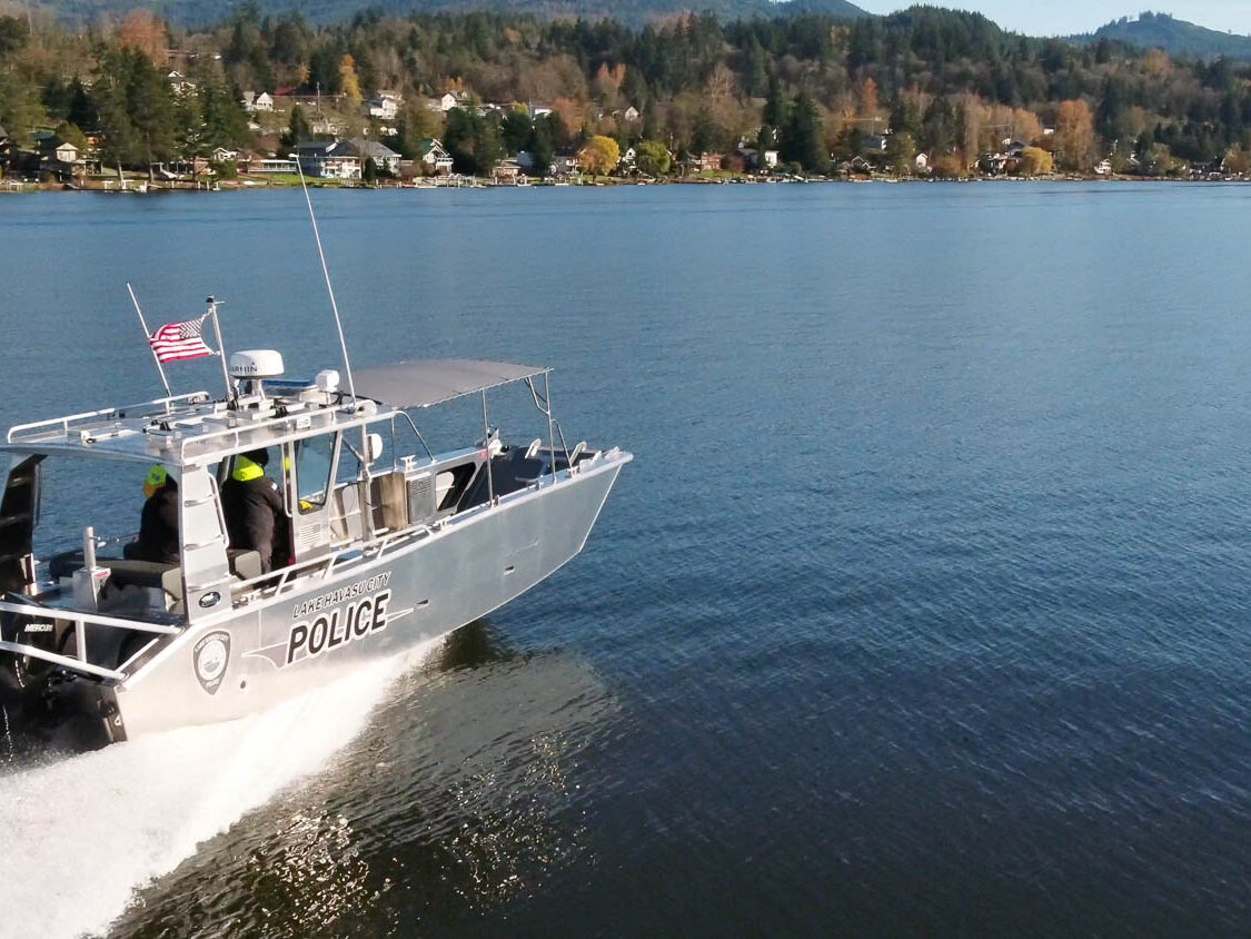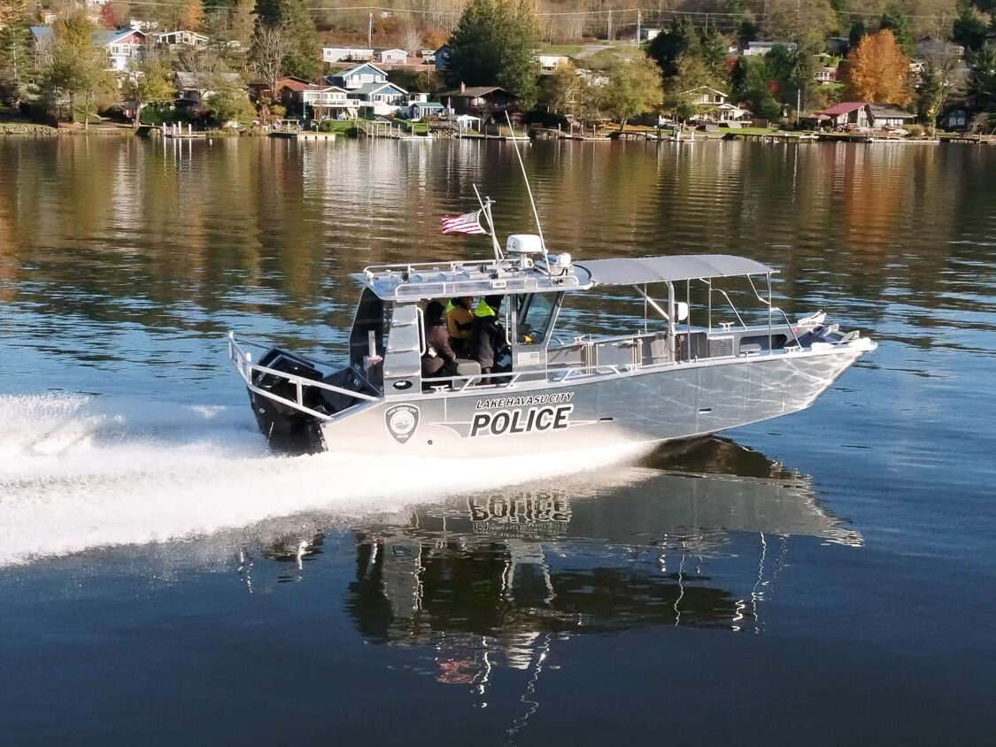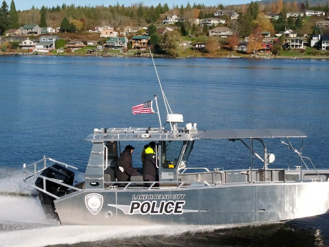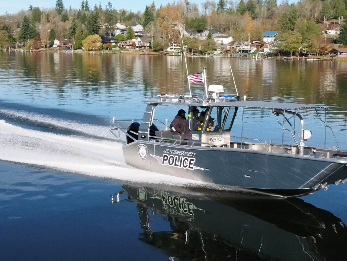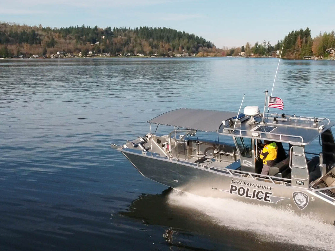 Lake Havasu, AZ: Lake Havasu Police selected this 28’ Packman as a patrol and dive/rescue vessel. Outfitting includes port and starboard dive doors, dive bottle racks, 500 lb. lifting davit and bow door dive ladder. A large canvas bimini top provides excellent shade protection during hot days. Additional outfitting includes a Garmin 8610xsv multifunction display, Whelen 100w siren, blue LED light bar, search light, solar battery charger, tow post and engine guard.