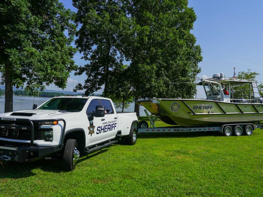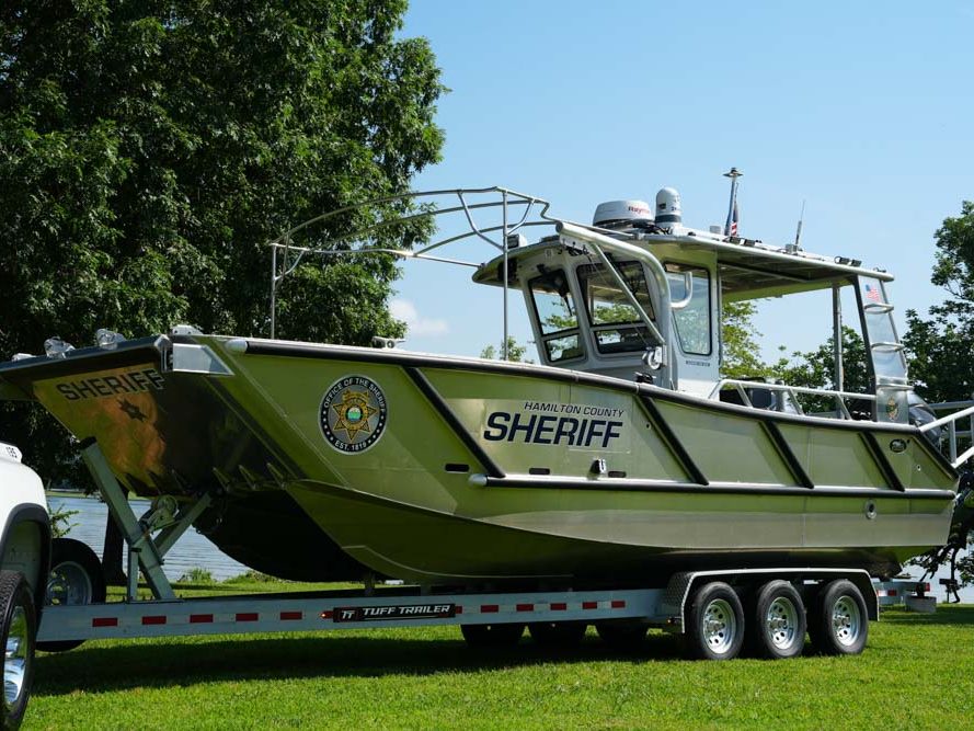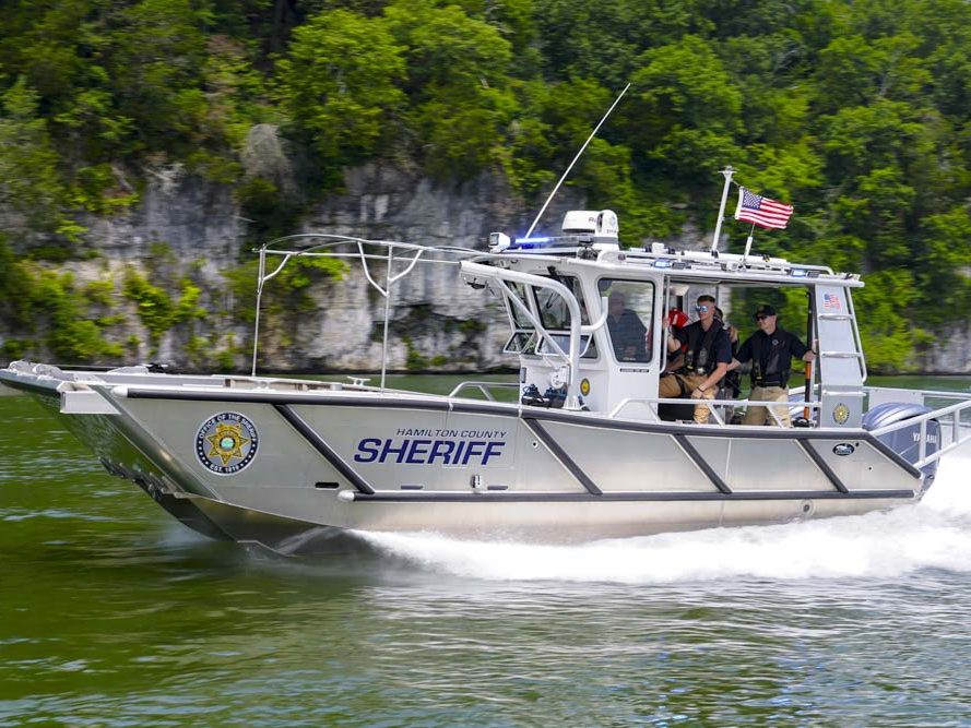 Chattanooga, TN: The Hamilton County Sheriff’s Office operates this 28’ Packcat on Chickamauga Lake, a 58 mile long reservoir on the Tennessee River boasting 810 miles of shoreline. Outfitting on their patrol boat includes Raymarine navigation electronics with dual 16” displays, Whelen light bar, FLIR thermal imaging camera, bow door and side door dive ladders, scuba tank rack, lifting davit, tow post and engine guard.
