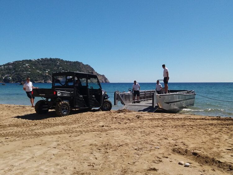 Cayman Islands: This 32’ Packcat serves as a yacht tender for a 59.6m private yacht. Outfitting includes seating for up to 18 passengers, four way lifting eyes, port & starboard boarding doors, dive ladder, fuel transfer pump, push knees, and retractable canvas bimini top. A forward control station allows for better visibility when transporting large vehicles.