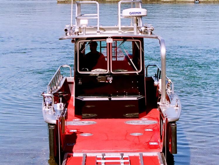 Pittsburg, CA: Located in San Francisco Bay, Contra Costa County Fire Department is responsible for emergency response for 88 square miles of water. Their 32’ Munson emergency response vessel is outfitted with a Hale 1500 GPM fire pump with bow & stern discharges, TFT Monsoon 2000 remote controlled roof monitor, Class B foam system, and 4” STORZ LDH for supplying full pump capacity to land based pumper trucks. Additional outfitting includes Furuno TZ Touch 2 radar/plotter/sounder, port & starboard dive doors, motor guard, trailer, and Mercury Joystick piloting controls with Skyhook GPS positioning system.