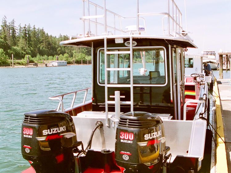 Afognak Island, AK: Located northwest of Kodiak Island, Hodge’s Afognak Island Lodge offers world-class fishing and hunting. Their 32’ Munson is designed to take advantage of the pure Alaska wilderness experience. The walk through cabin includes seating for six passengers, Webatso cabin heater, head compartment and galley. Additional outfitting includes an aft control station, downriggers, davit with pot puller, underdeck fish hold and cleaning table. A Steelhead ES-1000 crane was installed on the cabin roof to facilitate launching & retrieving a Highfield hard bottom dinghy with 9.9 HP outboard. Twin Suzuki 250 outboards were installed with Optimus 360 joystick controls with station hold capability.