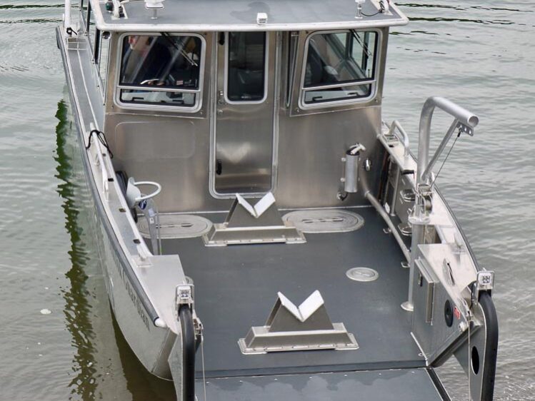 Lake Mead, NV: The National Park Service’s Submerged Resources Center uses their 32’ Packcat to continue their goal to inventory, document, and preserve submerged cultural and natural resources in our National Parks. Outfitting on their vessel includes a full width cabin with rooftop air conditioner, co-pilot station with cable passthroughs to the bow deck, 12V anchor windlass, lifting davit, bow door and side door dive ladders, tow post and engine guard.