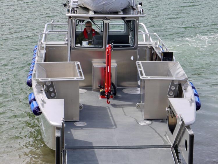 Sitka, AK: The City of Sitka Harbor Department operates and maintains 5 boat harbors and is responsible for emergency response and environmental cleanup operations. Their 32’ Packcat is outfitted with a 1-ton telescoping boom crane, removable hinging fish totes, port & starboard side doors, push knees, tow post, engine guard and triple axle trailer.