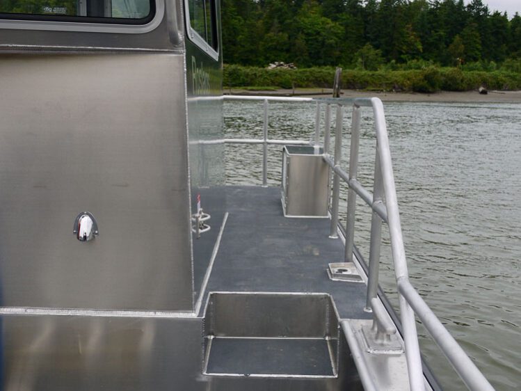 Juneau, AK: F/V Goodlooking operates as a commercial halibut longliner in SE Alaska. A rear helm station is available while gear is deployed over the stern, and a forward station with sump allows the operator to be out of the way while retrieving gear through the bow door. The main deck features a 9hp hydraulic power pack and is designed to secure standard fish totes. The insulated wheelhouse includes a 48" aft overhang and offers cabin heat.
