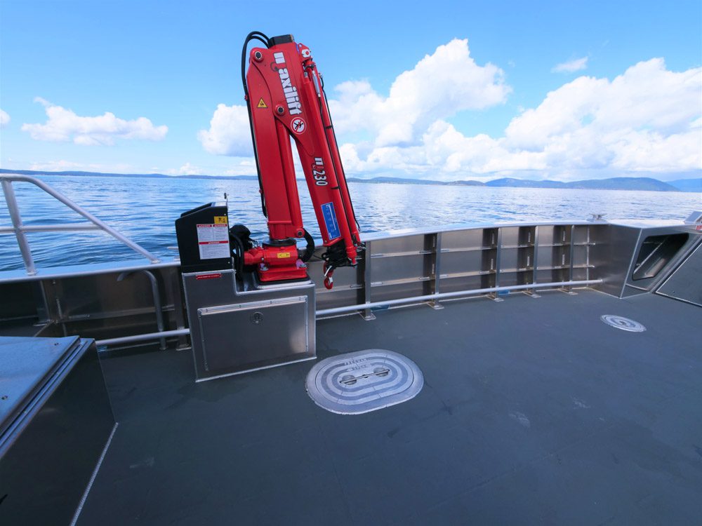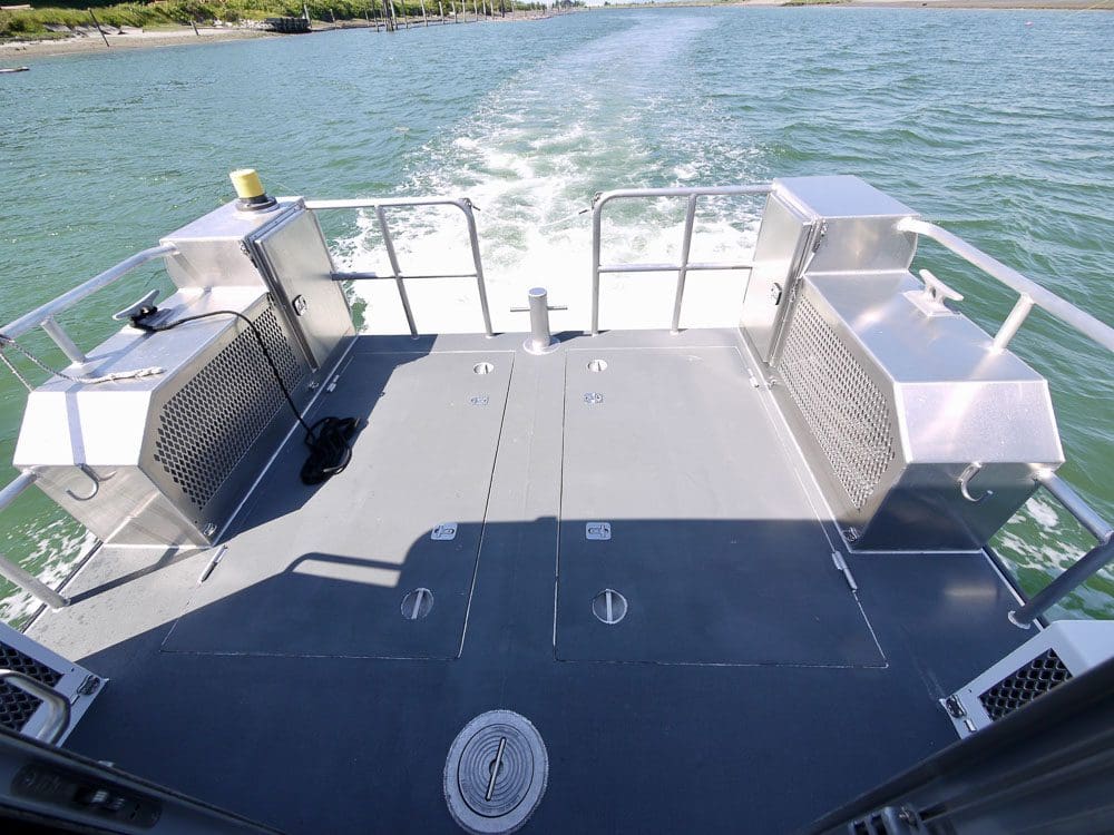 Yellowstone Lake, WY: Global Foundation for Ocean Exploration uses their 38’ Munson to explore the depths of Yellowstone Lake, a large volcanic crater. The lake bottom contains hydrothermal vents with microbes and geology that are similar to what is found in the deep ocean. The 2-ton deck crane is used to deploy an underwater robot with sampling and filming capabilities for studying this extremely unique environment. The cabin is outfitted with a large workstation, head, air conditioning, and CPU rack. Twin Hamilton Jets with Blue Arrow controls and JET Anchor provides station keeping to set a single GPS point mooring for hands free operations while conducting deep water research.