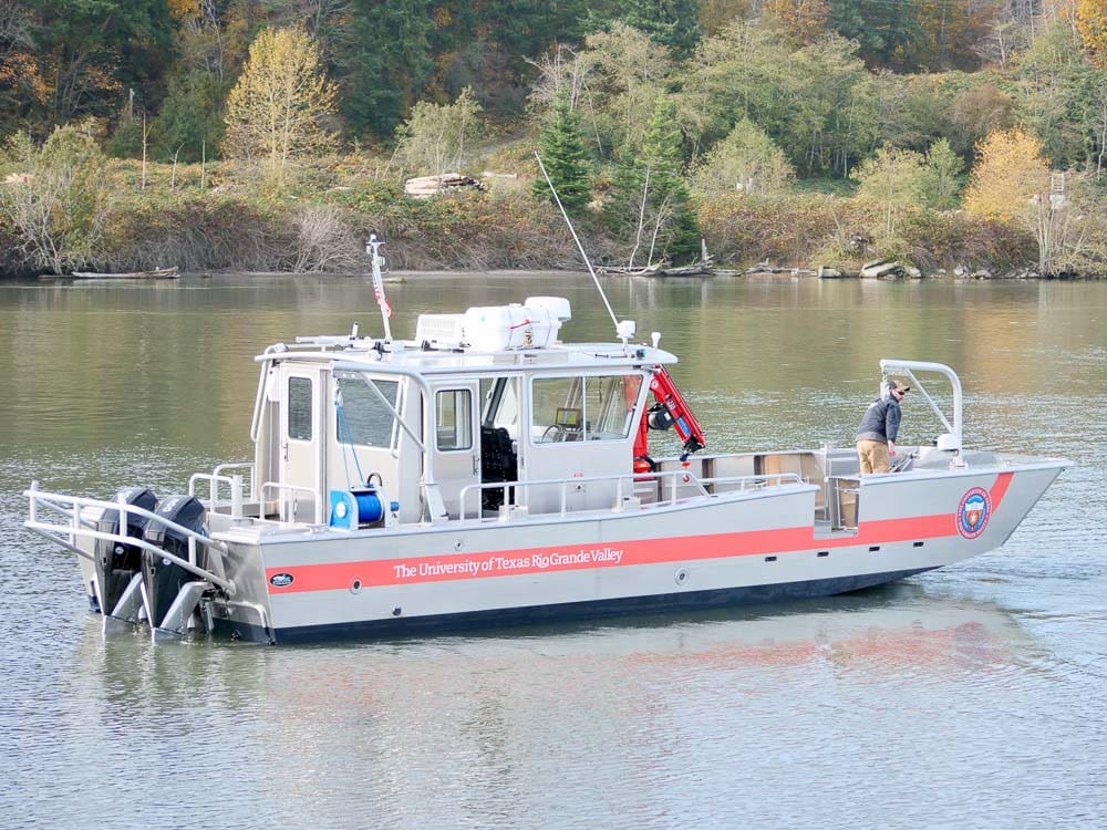 Port Isabel, TX: The University of Texas Rio Grande Valley selected this 38’ Munson for their School of Marine Science. A Maxilift telescoping crane and multiple lifting davits are used to deploy and retrieve research equipment 100+ miles out in the Gulf of Mexico. Other outfitting includes a side dive door with ladder, USM (Universal Sonar Mount), Onan 17kw diesel generator with hydraulic PTO, hydraulic deck winch and fresh water washdown system. The cabin includes air conditioning, head compartment, refrigerator and four person settee. Electronics include a Garmin 7612 radar/plotter/sounder with AIS and Mercury joystick piloting system with digital anchor.