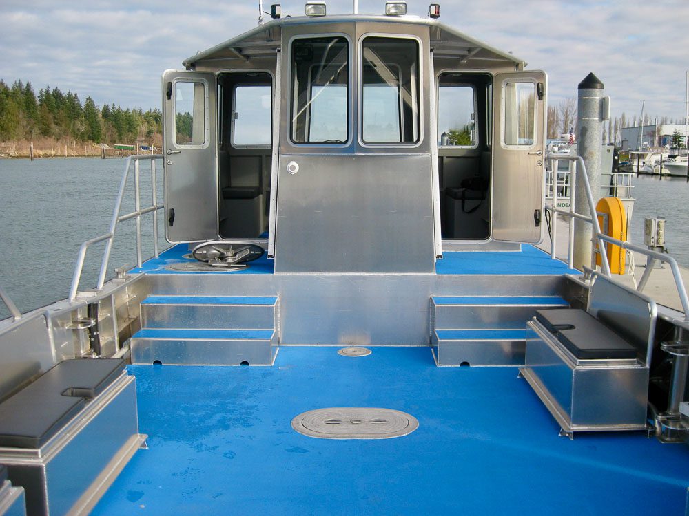Anchorage, Alaska: Hamilton Construction Company specializes in large scale projects over bodies of water, such as highway bridges and railroad trestles. Their 38’ Munson is outfitted with a tow post, engine guard, push knees, side door, lifting eyes, davit, anchor windlass and canister life raft. The cabin is outfitted with seating for 8 passengers, head, forced air heater, and galley with sink, stove & refrigerator.