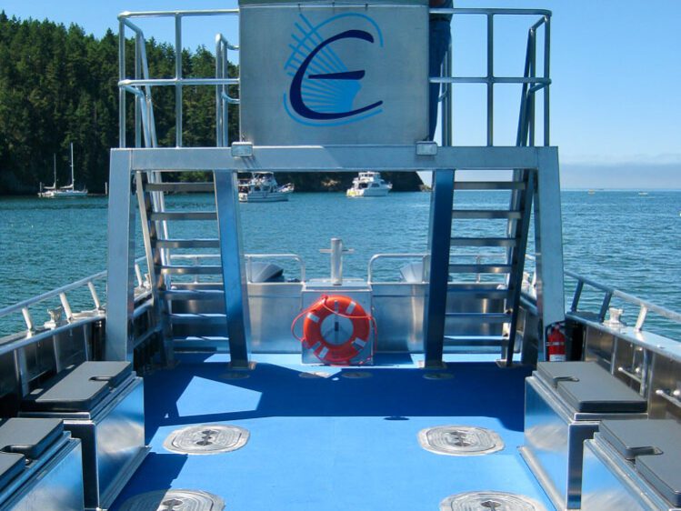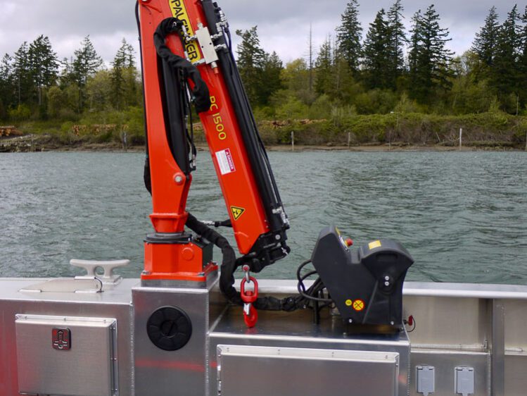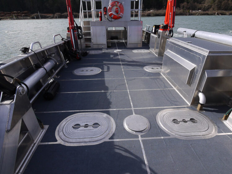 El Segundo, CA: The Chevron El Segundo Refinery is the largest refinery on the West Coast. Its Offshore Marine Terminal is located 1.5 miles from land and is connected via underwater pipelines. The M/V J. Skara is a dedicated oil spill response vessel responsible for protecting beaches and wildlife. A Lamor LPP6 HA/75C diesel power pack provides power for running oil skimmers and equipment. Two 4’ x 6’ under deck holds are installed on the foredeck for storage of equipment. The elevated cabin is outfitted with seating for 4 passengers. Additional outfitting includes a MaxiLift 110 telescoping boom crane and port & starboard side dive doors.