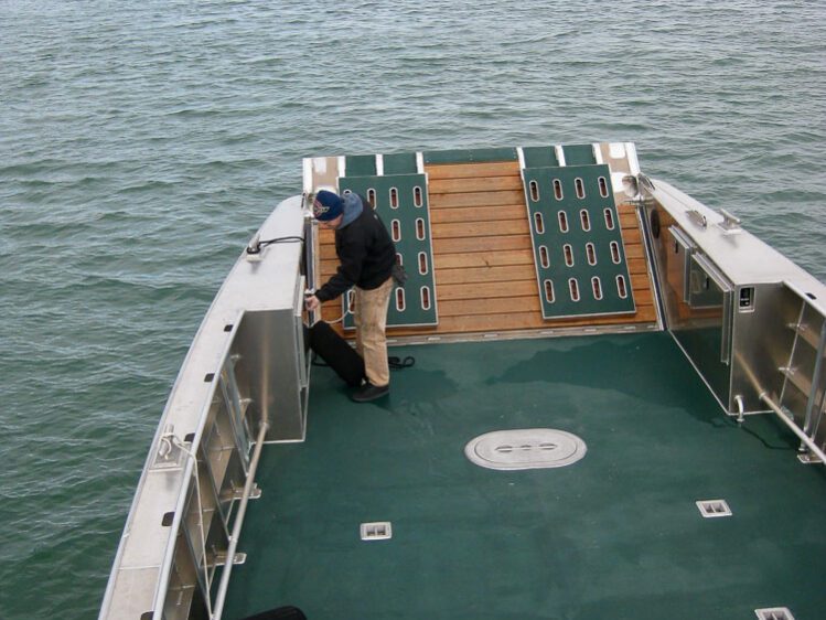 Our 44’ Series is available in 14’ beam in both mono hull and catamaran designs. Twin 350-425 HP outboards are used commonly used. Triple or quad 250-350 outboards can be utilized for high speed, heavy load applications. Twin inboard diesels with sterdrives or waterjets are also available for the 44’ Series. The addition of a 12V bow thruster can make a Munson 44 easy to handle.
