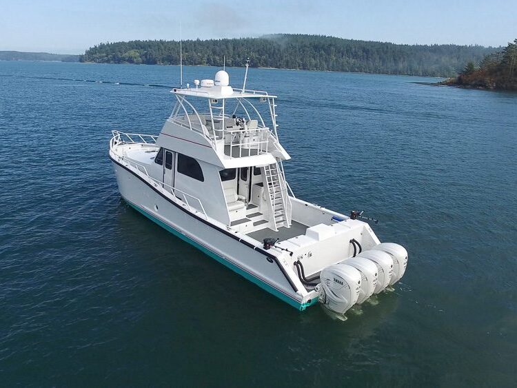 San Diego, CA: Designed for serious offshore fishing in Southern California waters, this 52’ Munson Sport Boat combines performance, comfort, and professional-grade outfitting with Quad 600hp Mercury Verado outboard motors, a 12kw north light generator, Seakeeper 6 Gyro stabilizer and Zipwake automatic trim leveling system. The vessels fishing equipment includes in deck insulated fish holds, integrated tackle boxes on the aft deck with central live well for bait, roof mounted outriggers and stern access doors for great access to the water. The cabin features a Flagship Marine air conditioning system, head compartment, “V” berth, galley and convertible settee. The console features dual Garmin 9000 series 22” MFD’s, open array radar, FLIR thermal imaging camera and Mercury’s JPO joystick piloting system for precision maneuvering and auto pilot.