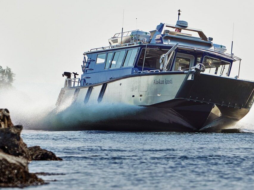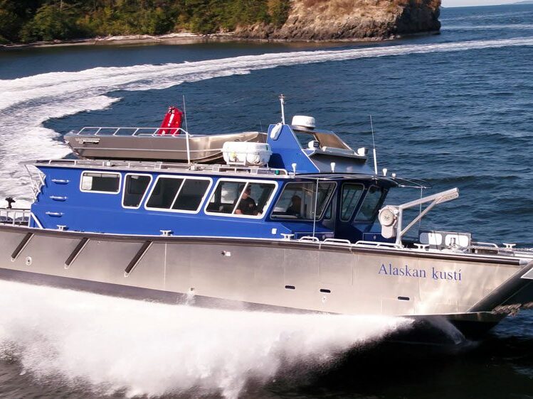 Gustavus, AK: Southeast Alaska Adventures provides tours of Glacier Bay National Park and surrounding areas. The 50’ M/V Alaskan Kusti operates as a USCG certified passenger vessel for sightseeing, fishing and hunting charters. The large cabin includes a full galley with hot water, stove, microwave and ample storage cabinets. The rear cabin is separated into a bunk room and head compartment with shower and vanity. SeaDek marine flooring and Corian countertops are installed throughout. The rooftop incorporates a Maxilift hydraulic crane for launching a Wooldridge 18’ jet sled. The forward and aft decks feature large fish holds, Bentley deluxe seating, Scotty downriggers, fish cleaning table, davit with pot puller and Sunbrella bimini tops for rain protection. Quad Yamaha 425’s provide an impressive 40 knot top speed and comfortable 30 knot cruise. The Yamaha Helm Master EX joystick control system provides precise maneuvering at low speeds.