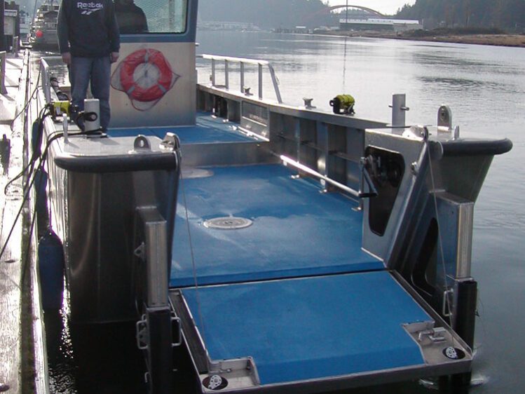 Richmond, CA: When an oil tanker arrives at the Chevron Texaco refinery in Richmond it is immediately surrounded by containment boom to protect the surrounding waterway in the event of an incident. When a tanker arrives the Wharf Raider 1 deploys containment boom by backing around the ship. Special round corners were incorporated into the transom to provide more control while vessel is in reverse. A removable hydraulic boom roller assists the crew in retrieving the boom.