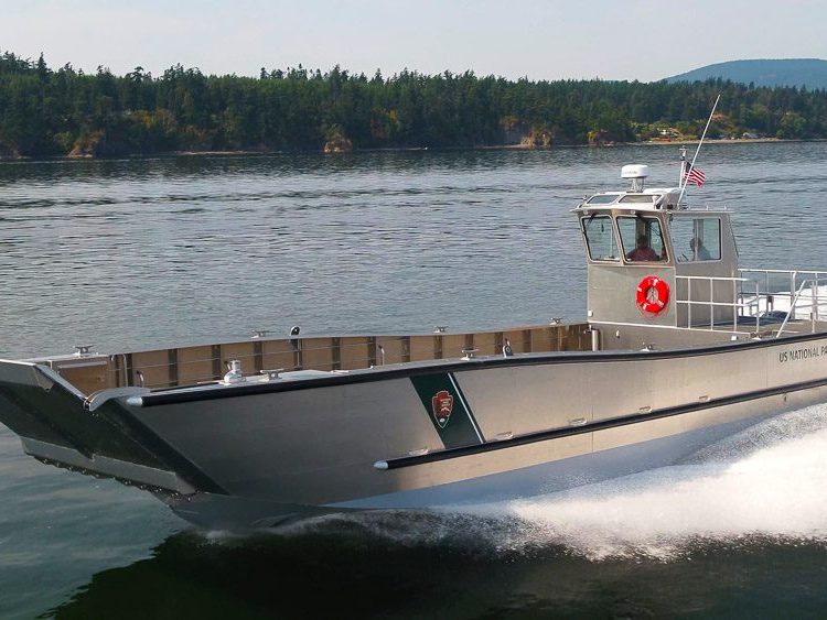 Bayfield, WI: This 28’ Munson landing craft joins a fleet of other Munson landing craft to transport people and equipment throughout the many islands that make up Apostle Islands National Park. Outfitting includes a heated cabin, Raymarine navigation suite, lifting eyes, tow post, bow mounted push knees and integrated D-rubber protection along the port and starboard sides.