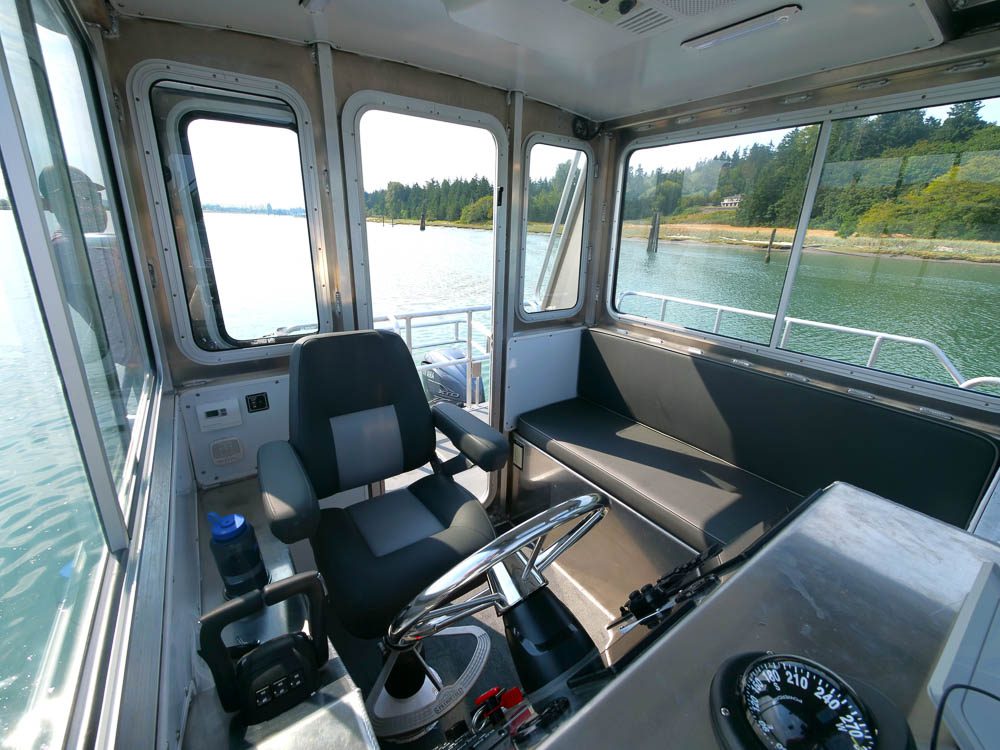 Anacortes, WA: Washington State DNR operates several Munson Boats including the 26’ M/V Perpetuity used to service DNR land in the San Juan Islands. Outfitting includes a full width cabin with seating for six, diesel cabin heater, tow post, engine guard, lifting davit and 12V anchor windlass. A large radar arch allows stowage of a dinghy on the cabin roof. Twin 150 HP outboards are installed on hydraulic jack plates for shallow operations.
