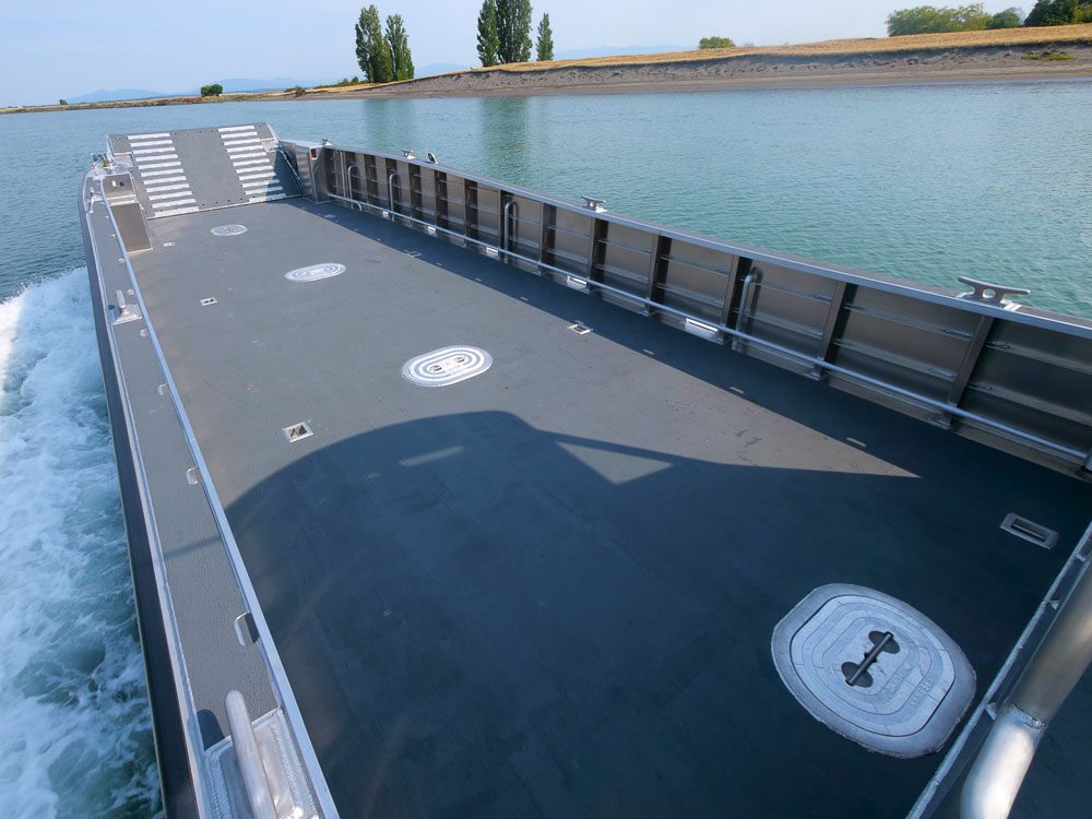 Lake Pend Oreille, ID: The US Army Corps of Engineers selected this 24’ Packcat for maintenance operations at Albeni Falls Dam, the site of a natural waterfall. Outfitting includes 5” tow post with 12V powered tow line reel with 150 feet of 5/8” synthetic floating line, engine guard, push knees, cargo deck tie down pockets and 3” pipe davit with 12V Powerwinch. Navigation electronics include a Garmin 8610xsv touchscreen plotter/sounder and marine VHF. A retractable bimini top covers the cargo deck. Twin Mercury 200’s provide plenty of power for pushing and towing operations.
