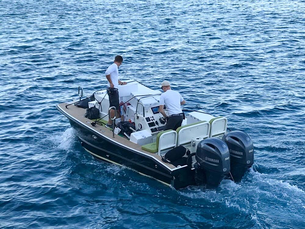 Bahamas: The 30’ Monsoon lives aboard a 48 meter yacht to serve as a fishing, diving and beach tender. The cabin accommodates seating for up to 8 passengers and includes a head, galley and air conditioning. Flybridge controls with joystick piloting offers excellent visibility when navigating over shallow reefs. The main deck and rooftop are finished with SeaDek to keep surfaces cool in intense heat and sun. Cargo deck tie down pockets allow for transport of various motorcycles to and from the mothership. A fuel transfer pump with 12’ hose and nozzle allows her to refuel other tenders on board.
